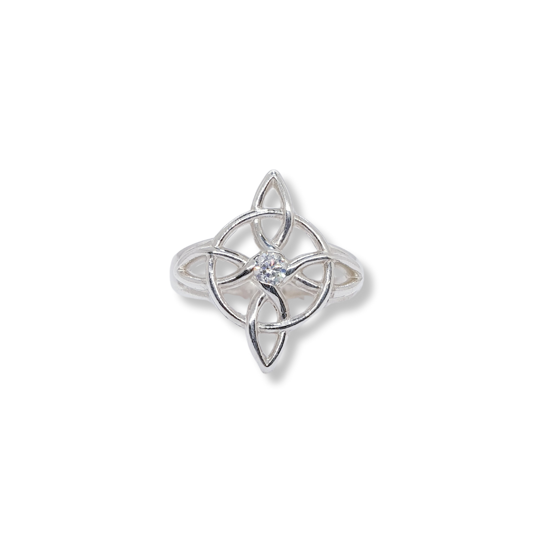 Místico y elegante, este anillo presenta el clásico diseño del nudo de bruja, símbolo de protección, adornado con un circon brillante que aporta un toque de luz y energía.