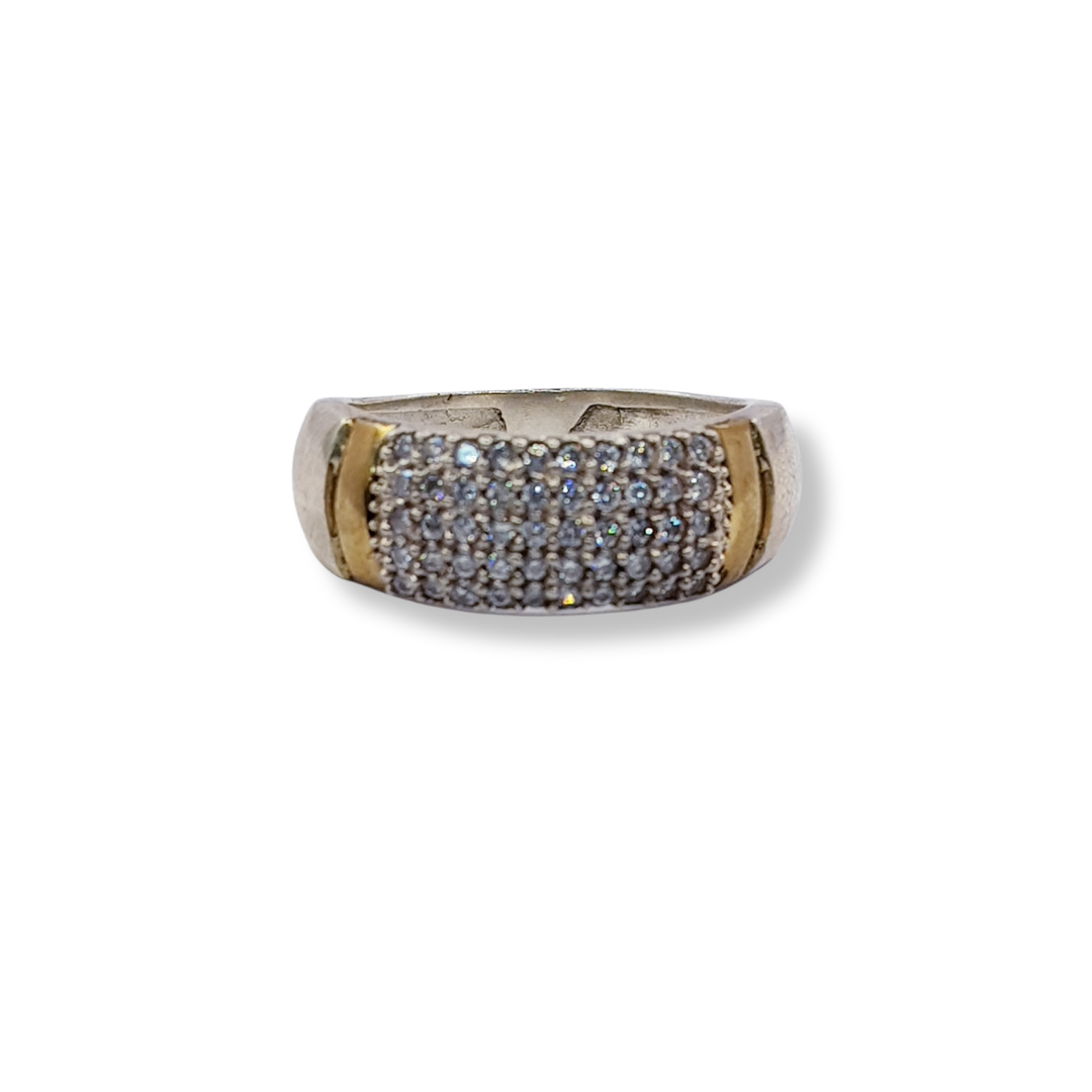 Anillo de plata 925 con detalles en oro y circones, una pieza sofisticada que combina la elegancia del bicolor con el brillo sutil de las piedras. Ideal para quienes buscan un accesorio delicado, moderno y con un toque de distinción.