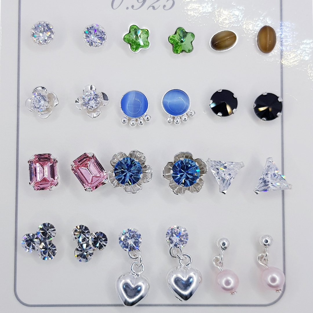 Set de 12 pares de aros con diseños variados para cada ocasión. Incluye estilos clásicos, modernos y delicados, ideales para combinar según tu look o estado de ánimo. Una opción versátil y completa para renovar tu colección de accesorios.