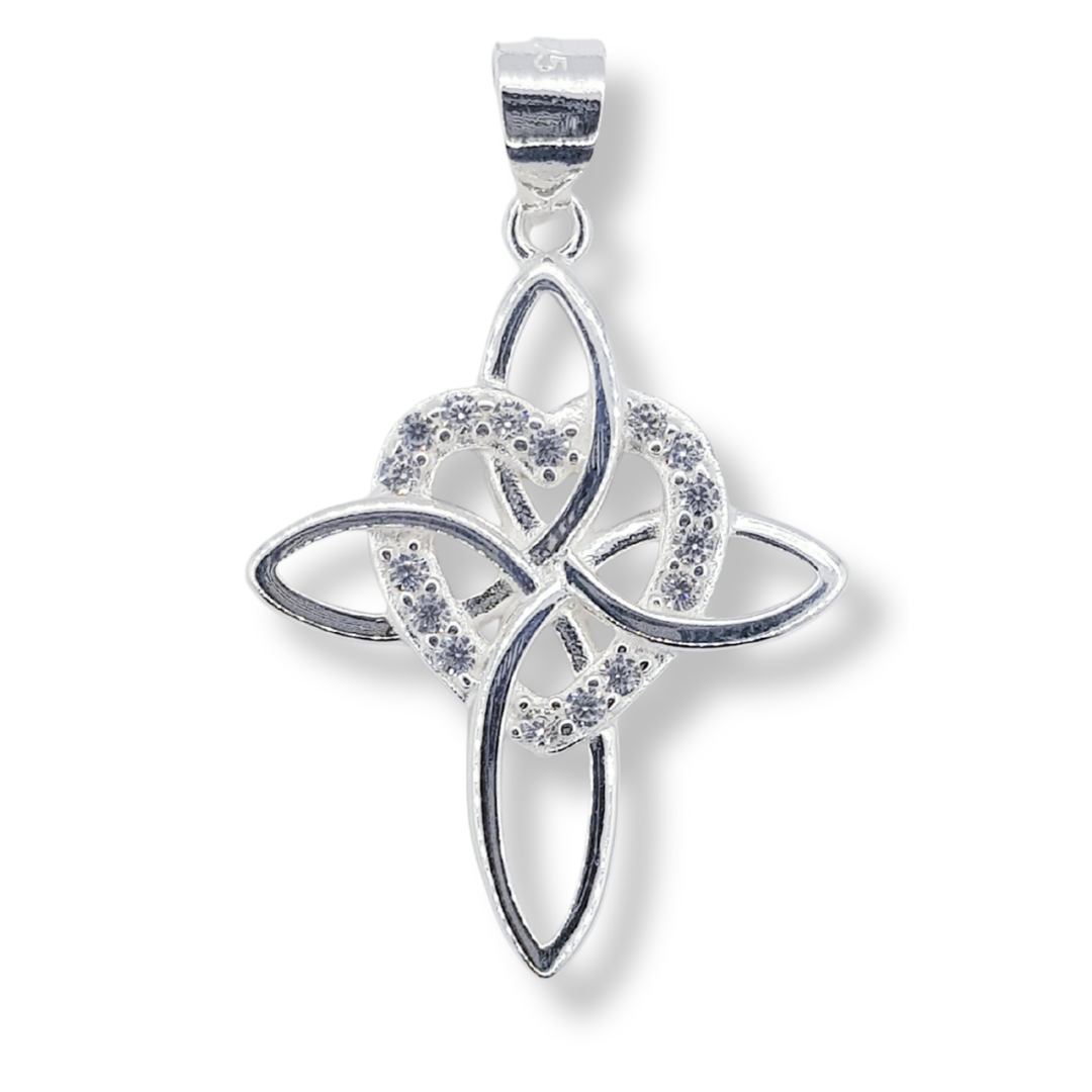 Colgante en forma de corazón con diseño de nudo de bruja, elaborado en plata italiana. Un símbolo de protección y unión, con un estilo elegante y significativo.