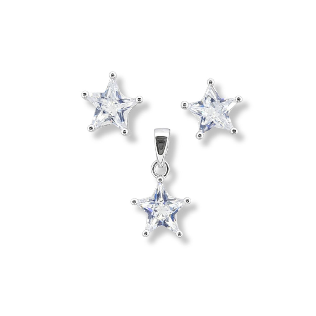 Delicado conjunto con diseño de estrella, elaborado en plata italiana y adornado con circonia brillante. Un estilo luminoso y elegante, ideal para cualquier ocasión.