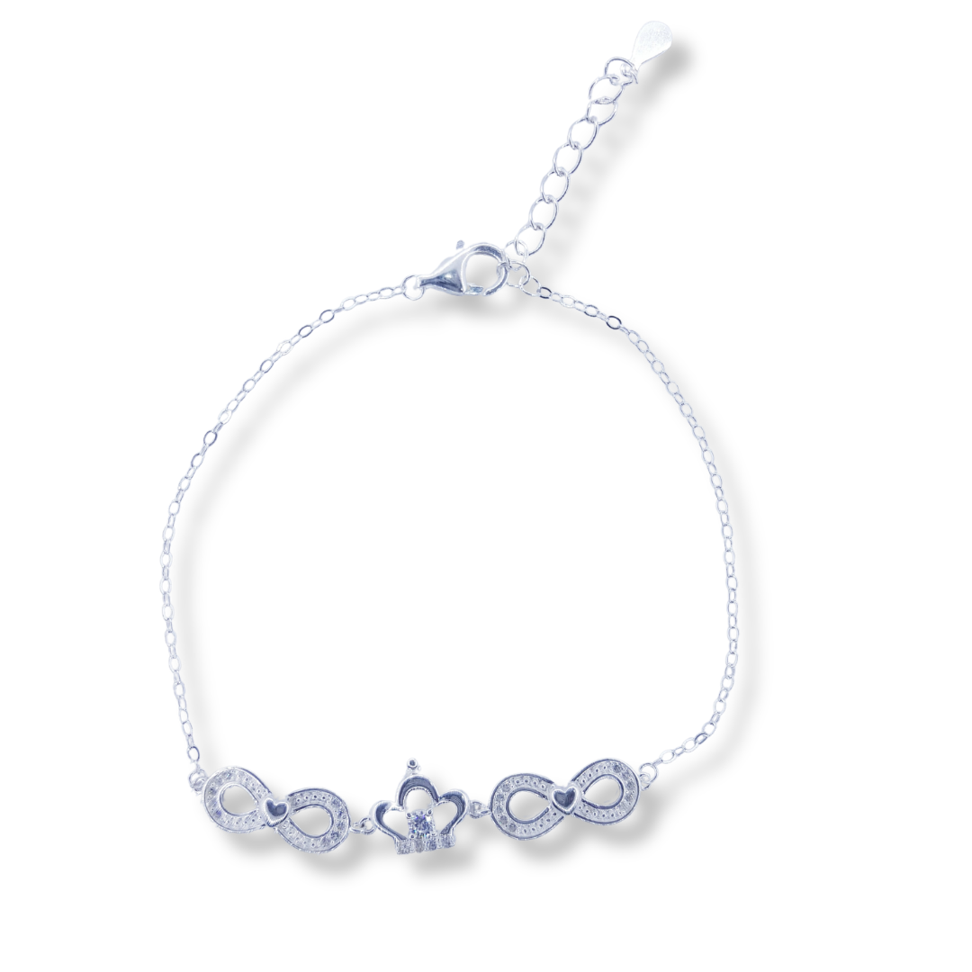 Delicada pulsera con diseño de corona e infinito, elaborada en plata italiana y decorada con circonia brillante. Un símbolo de poder, amor eterno y elegancia.