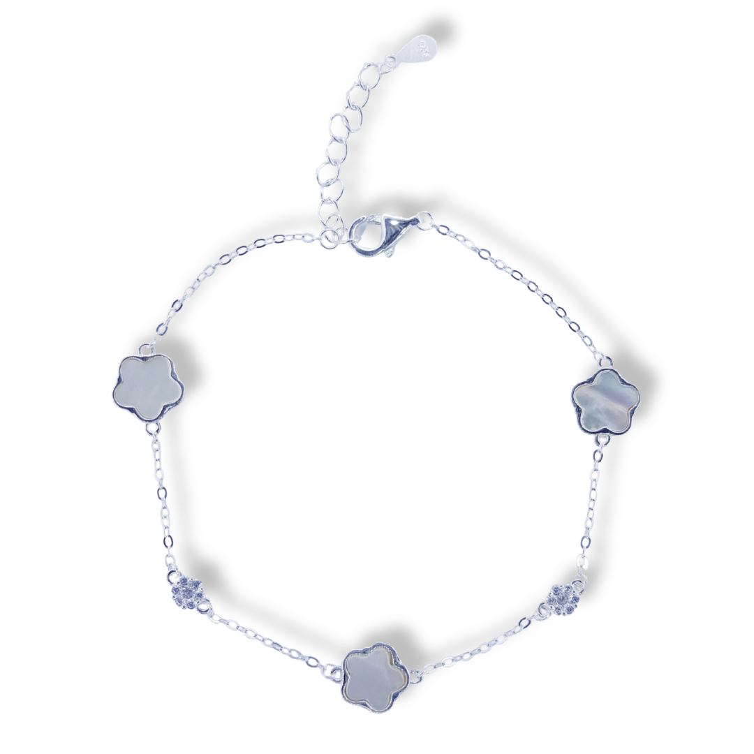 Delicada pulsera con diseño de flor, elaborada en plata italiana y con detalles en nácar. Un estilo elegante y femenino, ideal para cualquier ocasión.